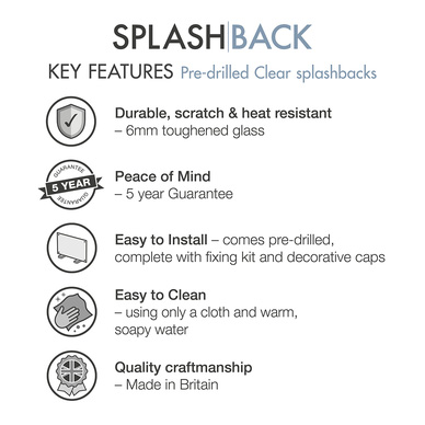 | Pack contents | Predrilled Clear Splashback with Brushed Chrome fixing pack |